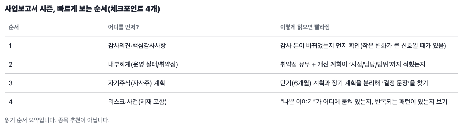 그럼 우리는 뭘 해야 하느냐. 여기서 중요한 건 ‘정독’이 아니라 ‘스캔’입니다. 서학개미가 10-K를 전부 읽는 게 아니라 MD&A에서 위험요인·현금흐름·자사주/주주환원 문장을 먼저 훑듯이, 국내 주식도 DART에서 사업보고서 중 “위험요인”과 “자기주식” 관련 문장을 먼저 잡아야 합니다. 3월에는 같은 날 수십 개 보고서가 쏟아지니, 시간은 더 부족해집니다. 정성껏 읽는 사람이 이기는 구간이 아니라, 위험 신호를 먼저 피한 사람이 이기는 구간에 가깝습니다.