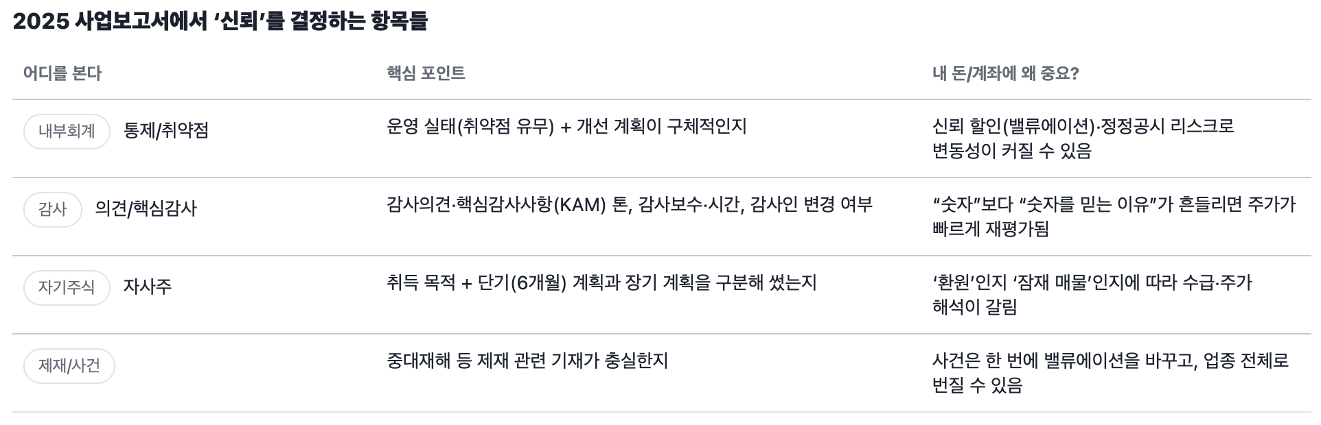 월급쟁이 입장에서 이게 왜 중요하냐면, 내가 들고 있는 종목이 ‘실적은 괜찮은데도’ 사업보고서에서 내부통제(내부회계)나 자기주식(자사주) 관련 설명이 빈약하다는 이유로 리스크 프리미엄을 맞을 수 있기 때문입니다. 반대로 말하면, 같은 업종에서도 공시가 탄탄한 회사는 불확실성이 줄어들면서 재평가를 받기도 합니다. 주담대·전세대출 이자처럼 매달 빠져나가는 돈은 뻔한데, 투자 계좌는 ‘신뢰’ 하나로 변동폭이 커지면 체감이 훨씬 큽니다.