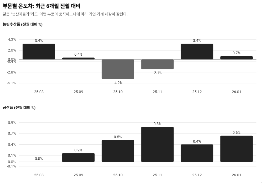 주식은 더 복잡합니다. PPI가 오르면 ‘금리 부담’이 커져서 성장주가 흔들릴 수 있지만, 동시에 특정 업종엔 ‘가격 환경’이 좋아질 수도 있어요. 이번엔 공산품에서 1차 금속(3.0%)과 컴퓨터·전자(1.8%)가 눈에 띄었습니다. 반도체처럼 가격을 주도하는 업종은 단가 상승이 매출로 연결될 여지가 있고, 소재·부품 쪽도 단가 환경이 나쁘지 않을 수 있습니다. 반대로 원가 전가가 어려운 내수 업종은 마진이 눌립니다. 그래서 같은 “물가” 뉴스가 KOSPI 대표 수출주에겐 다른 얼굴로, 소비·유통·외식 같은 업종엔 또 다른 얼굴로 들어옵니다.