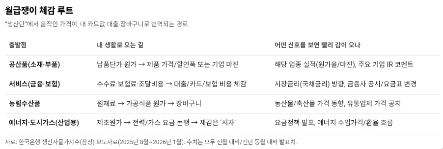 여기서 질문이 생깁니다. “그래서 내 생활비가 당장 오르나?” 체감은 바로 오지 않을 수도 있어요. PPI는 ‘도매·원가 단계’의 물가라서, 기업이 가격을 전가하는 속도는 업종마다 다릅니다. 다만 방향이 위로 고정되는 순간부터는 생활비가 ‘한 번에 폭발’하기보다 ‘조용히 새는’ 방식으로 늘어나는 경우가 많습니다. 요즘처럼 구독료, 배달비, 통신비, 각종 수수료가 생활을 구성할수록 더 그렇고요.