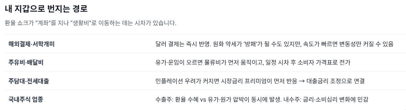 환율 급등이 가장 빨리 닿는 곳은 해외결제다. 애플 구독, 게임 결제, 해외직구, 해외여행 예약 같은 달러 결제 항목은 다음 청구서에 바로 찍힌다. 그 다음은 주유비와 배달비 같은 생활비다. 유가가 오르면 정유·물류·항공 요금이 움직이고, 그 비용은 결국 소비자에게 전가된다. 마지막이 금리다. 인플레이션 압력이 커지면 시장금리가 먼저 반응하고, 은행 대출금리는 뒤따라 조정된다. 주담대·전세대출을 가진 사람에게는 “환율 뉴스”가 결국 “이자 뉴스”가 되는 구조다.