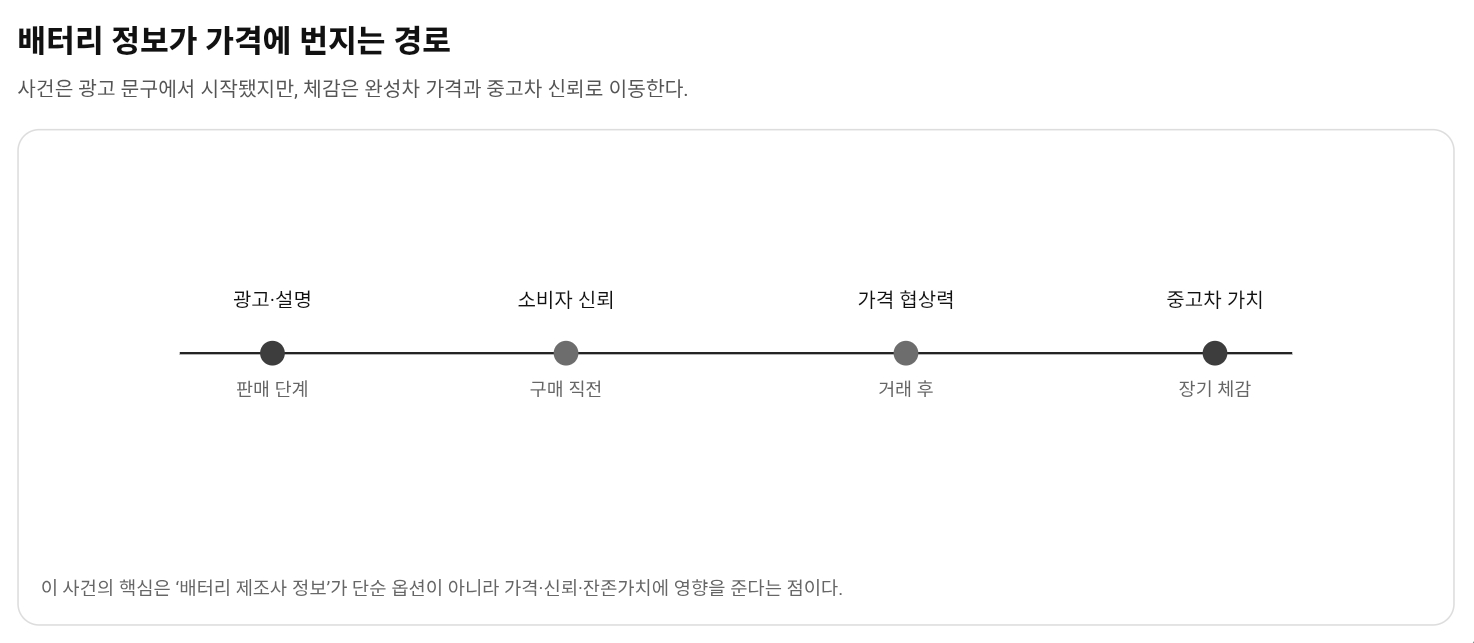 자동차는 다른 소비재보다 정보 비대칭의 비용이 크다. 충전기 하나를 잘못 사면 몇 만원 손해로 끝나지만, 차량은 수천만원짜리다. 더구나 배터리 정보는 단순 옵션이 아니라 화재 위험, 보험료, 리콜 대응, 중고차 잔존가치에 영향을 준다. 소비자가 “세계 1위 배터리라고 들었는데 아니었다”는 순간, 벌금보다 더 비싼 건 브랜드 프리미엄의 훼손이다.