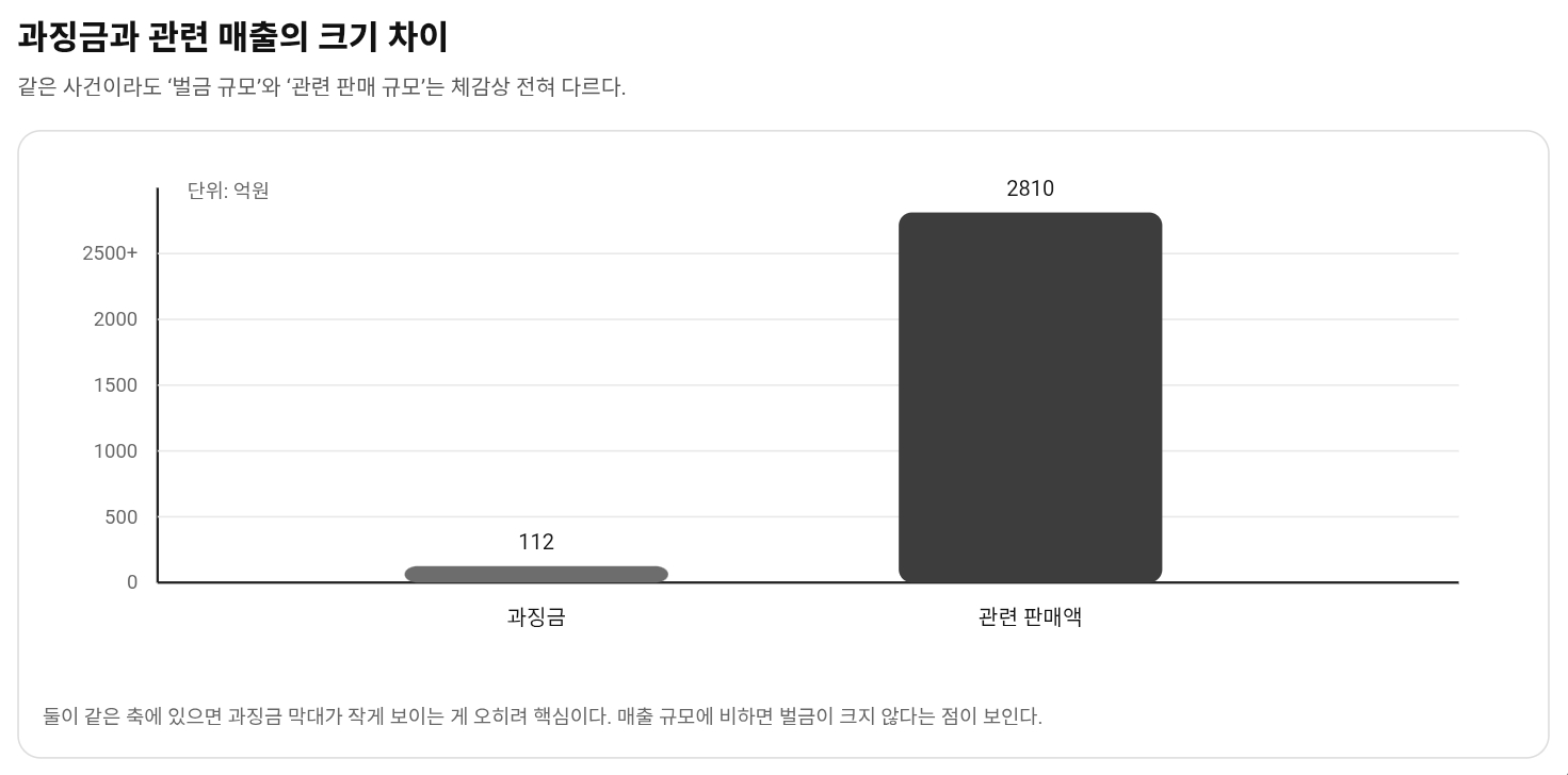 이번 과징금 112억3900만원은 숫자만 보면 커 보인다. 하지만 관련 판매액 2810억원과 나란히 놓으면 해석이 달라진다. 벌금 규모보다 더 크게 남는 건 소비자 신뢰의 손상이다. 공정위 결정과 검찰 고발까지 이어진 순간, 이 사건은 단순한 마케팅 실수가 아니라 “이 브랜드가 중요한 정보를 어디까지 숨길 수 있었나”로 읽히게 된다.