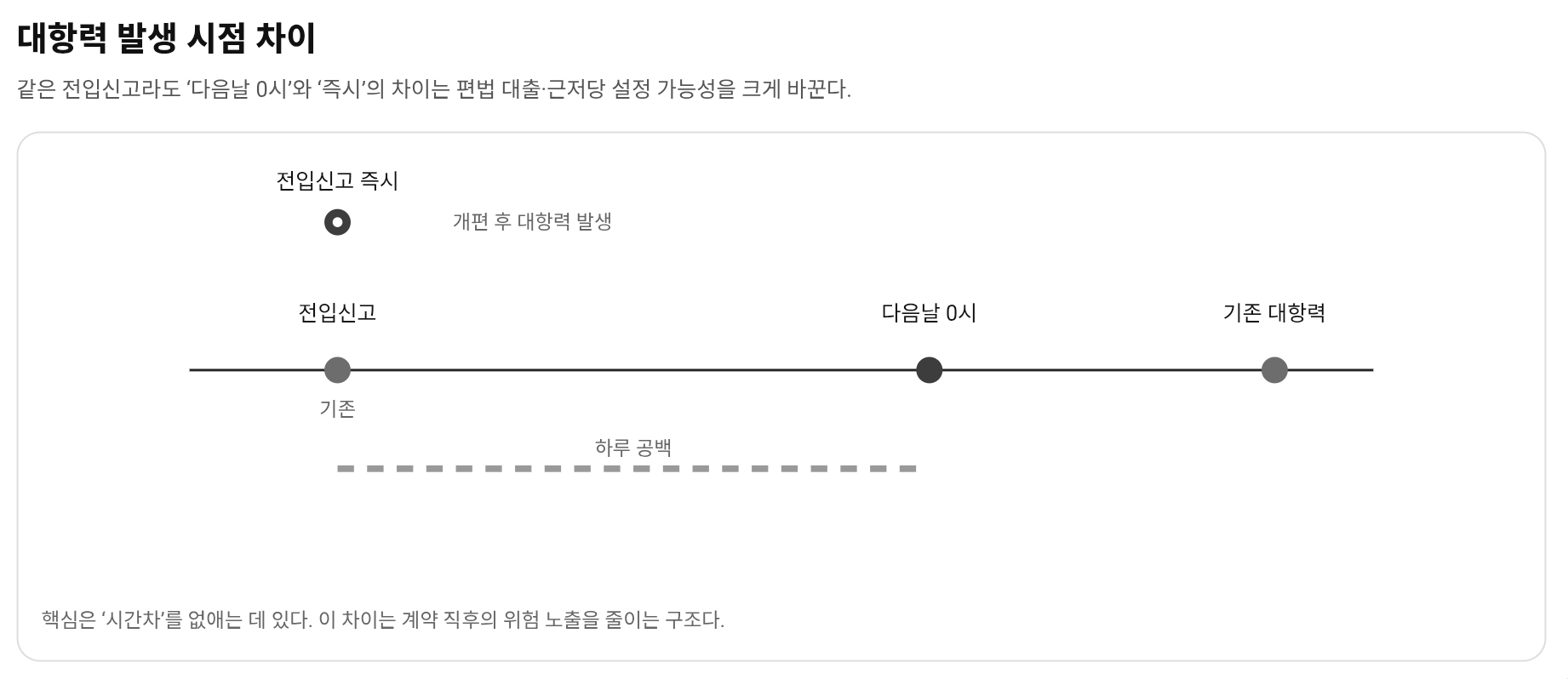 기존에는 세입자가 전입신고를 마쳐도 대항력이 보통 다음날 0시에 생기는 구조였다. 반면 임대인은 당일에 대출을 받아 근저당을 설정하면 효력이 먼저 발생할 수 있었다. 이 시간차는 제도 설명에선 짧게 지나가지만, 실제 계약에선 가장 비싼 틈이었다.