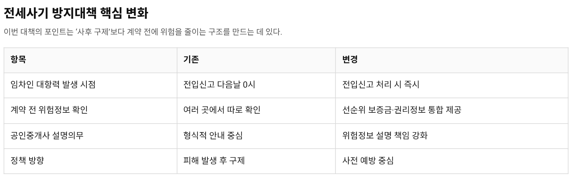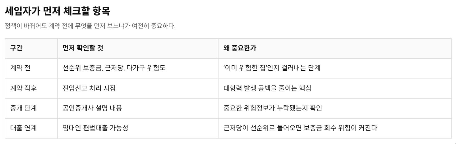 개인에게 이게 중요한 이유는 명확하다. 전세사기 문제는 집값 전망보다 훨씬 먼저 체감된다. 계약 직후 하루 차이로 보증금 회수 우선순위가 바뀌고, 위험한 집인지도 계약 전에 제대로 모른 채 들어가는 경우가 많았기 때문이다. 이번 대책의 의미는 “사기를 세게 처벌하겠다”보다 “덜 당하게 만들겠다”에 더 가깝다.