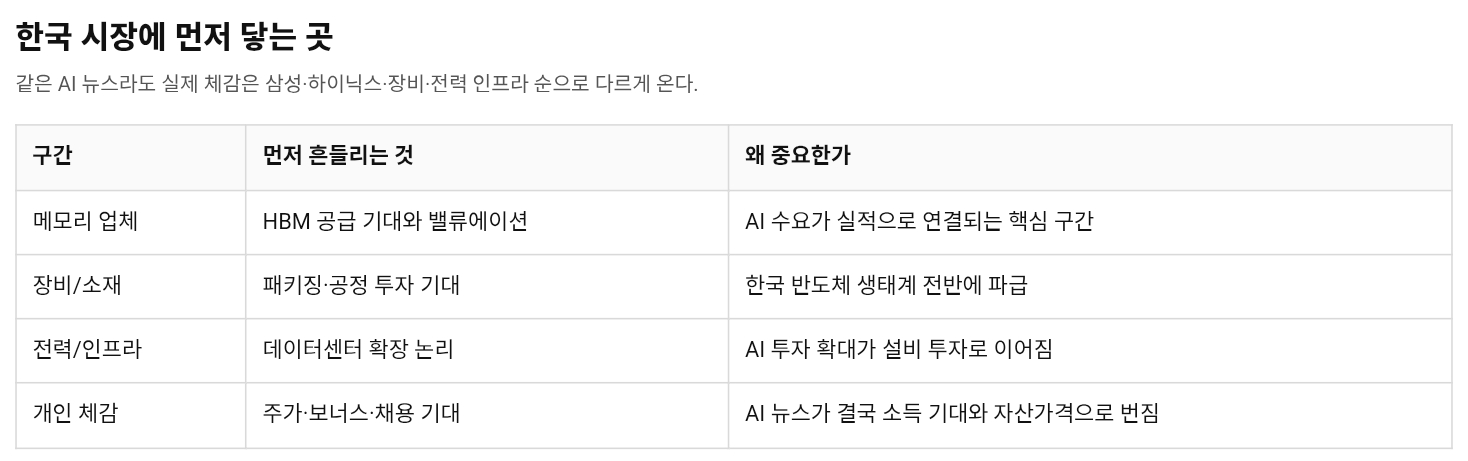 개인 투자자 입장에서는 뉴스가 너무 멀게 느껴질 수 있다. 하지만 이런 계약은 결국 한국 증시에서 메모리 밸류에이션, 장비주 기대, 채용·보너스 심리, 전력·데이터센터 투자 기대까지 차례로 번진다. AI 뉴스가 계좌에 찍히는 순서는 생각보다 단순하다. 가장 먼저 반응하는 건 ‘기술 혁신’이 아니라 ‘누가 병목을 잡았느냐’다.
