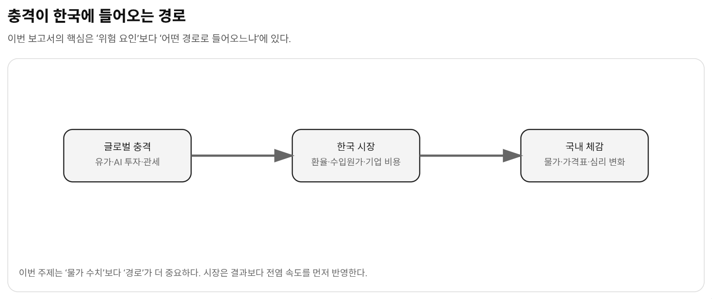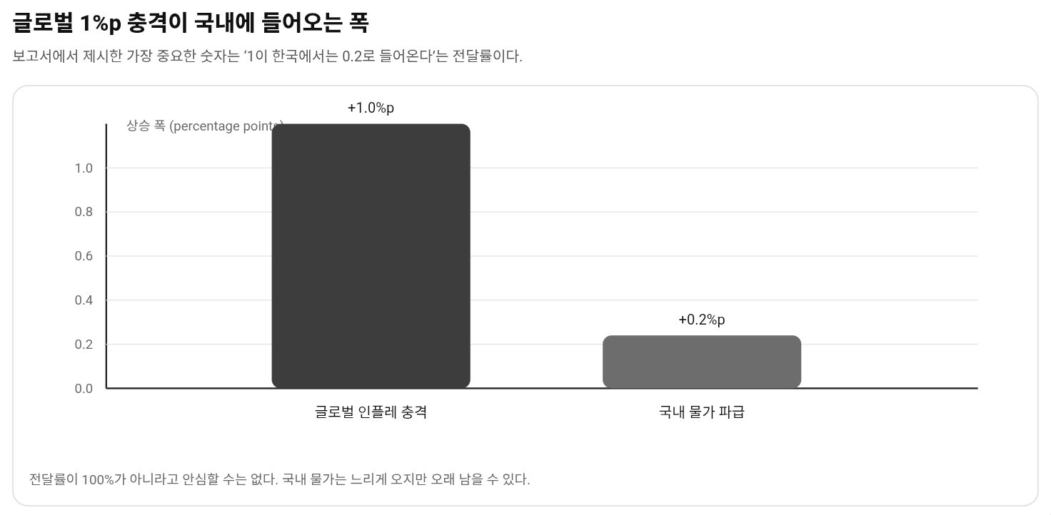 보고서의 핵심 숫자는 단순하다. 글로벌 물가가 1%포인트 오르면 한국 물가는 0.2%포인트 정도 자극될 수 있다는 것이다. 겉으로 보면 작아 보인다. 그런데 이 0.2가 문제다. headline에서는 작은 숫자처럼 보이지만, 실제로는 기업 원가와 환율을 통해 여러 번 나눠서 오래 남을 수 있기 때문이다.