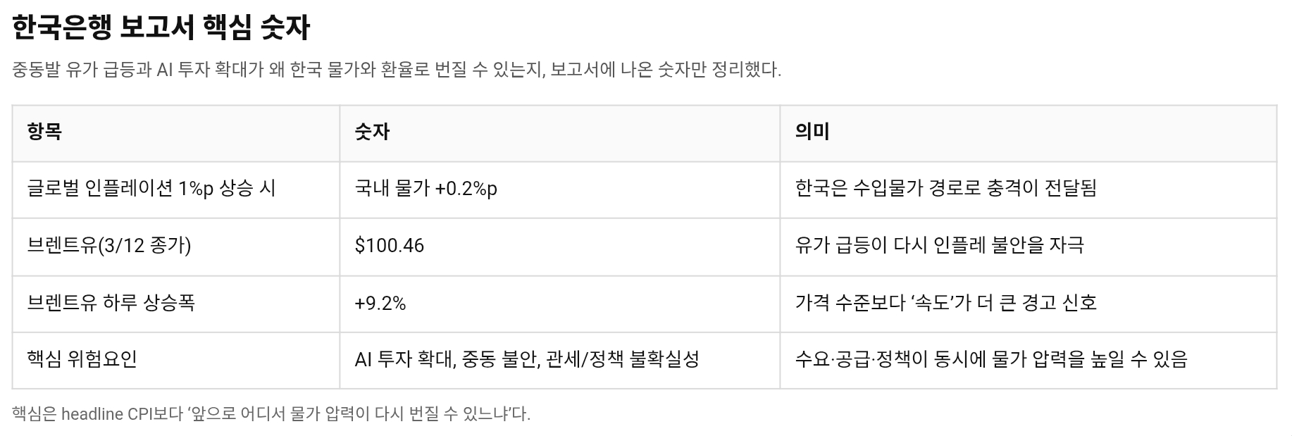 중동발 유가 급등과 AI 투자 확대가 한국 물가에 어떻게 번질지 한국은행이 경고했다. 글로벌 인플레 1%p 상승이 국내 물가 0.2%p로 들어오는 구조와, 환율·수입원가·가격표가 움직이는 순서를 정리한다.