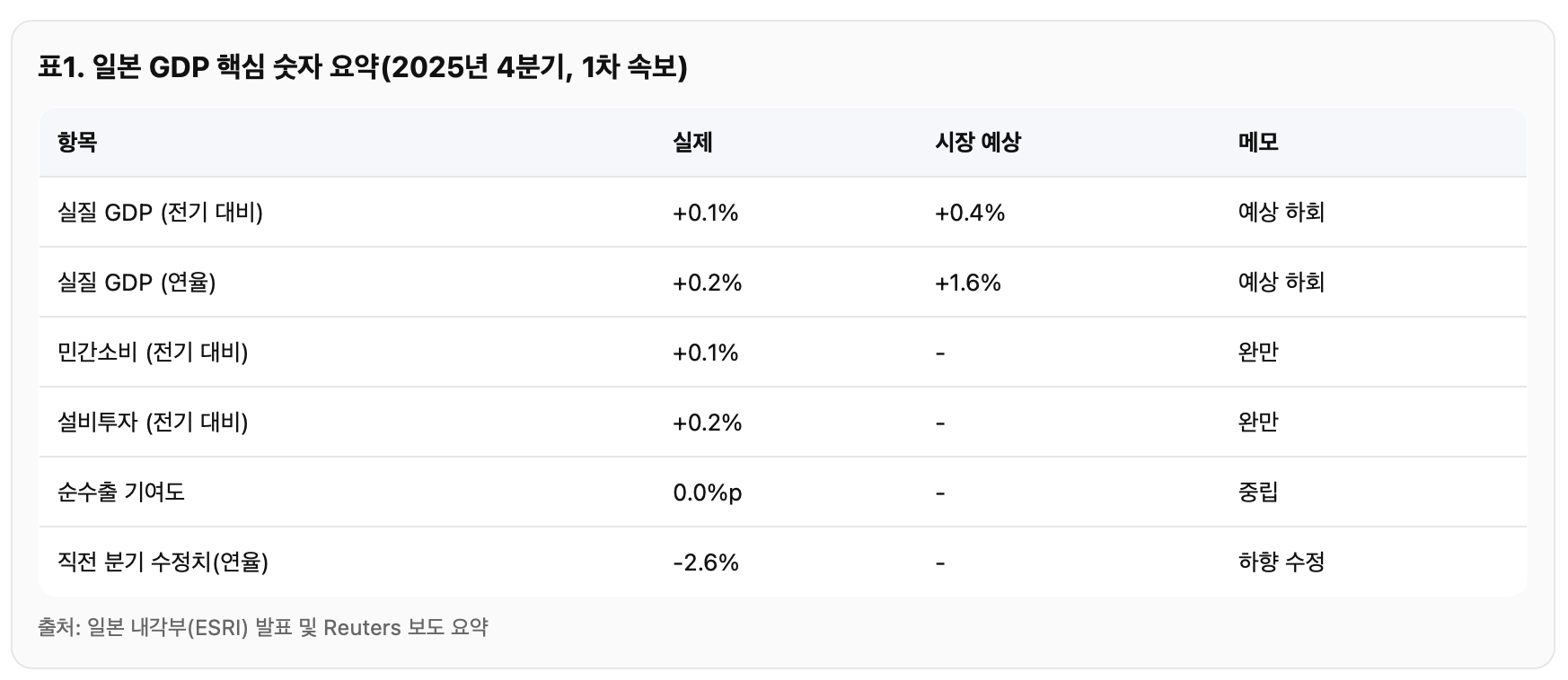 일본 4분기 GDP가 예상치에 한참 못 미쳤다. 엔화 방향과 아시아 시장 심리가 동시에 흔들리면서 한국의 환율·주식·여행비·수출기업 실적에 미칠 파장을 ‘숫자+타임라인’으로 정리했다. 이번 주 체크포인트도 3개만 뽑아 바로 써먹게 만든다(직장인용 딱). 서론월요일 아침에 일본 GDP 뉴스가 뜨면 “일본 얘기가 내 월급이랑 무슨 상관?”부터 나오죠. 근데 일본은 한국이 매일같이 부딪히는 ‘환율·수출·여행비’의 진짜 큰 축이에요. 일본 경기가 기대만큼 안 나오면 엔화가 흔들리고(혹은 반대로 ‘금리 인상 기대’로 강해지고), 그 파장이 원·달러, 아시아 증시, 한국 수출주 실적까지 번져요.오늘 포인트는 단순합니다. 일본 경제가 2025년 4분기(10~12월)에 “간신히 플러스”로 나왔는데, 시장이 기대하던 속..